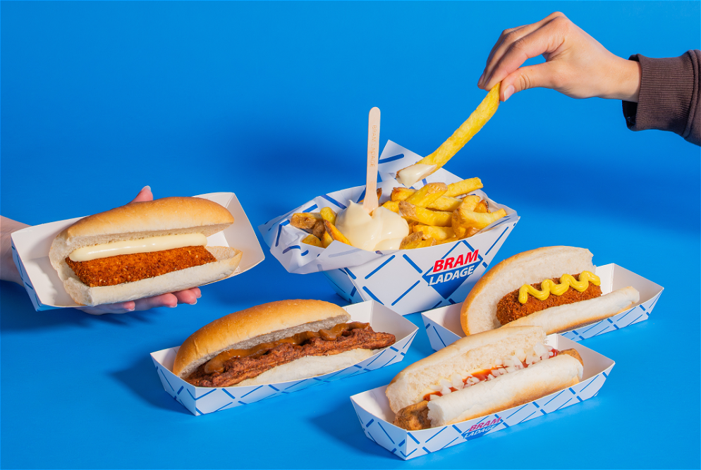 Krokante vega kipburger op een broodje met sla en saus naar keuze (classic, spicy of pinda met gebakken uitjes) met daarbij een lekkere middel Bram verse patat en een drankje naar keuze.